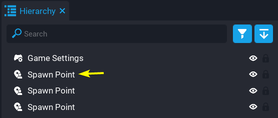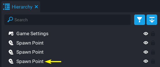 Spawn Points represent locations that a player can spawn or respawn at. The Spawned Settings object is used to determine which Spawn Point a player will spawn/respawn at.