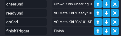 3. Drag and drop the audio for crossing the finish line as a custom property and rename it to cheerSnd.