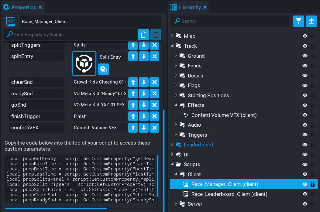 3. Drag and drop the effect onto the RaceManager_Client script as a custom property and rename it to confettiVFX.
