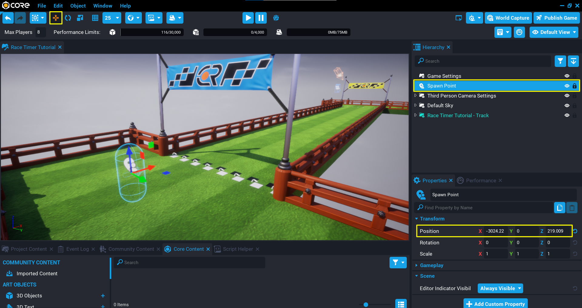 A track has been uploaded to Community Content to help you get started. This can be imported from the Community Content panel by searching for Race Timer Tutorial - Track by CoreAcademy.